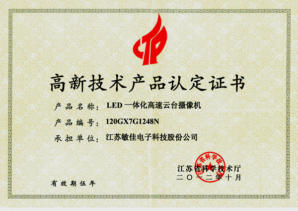 2012年10月,我公司LED一體化高速云臺(tái)攝像機(jī)獲得由江蘇省科學(xué)技術(shù)廳頒發(fā)的“高新技術(shù)產(chǎn)品認(rèn)定證書“,編號(hào)為:120GX7G1248N。這標(biāo)志著敏佳高速云臺(tái)攝像機(jī)在技術(shù)創(chuàng)新上邁上了一個(gè)新的臺(tái)階,同時(shí)也是對(duì)敏佳高速云臺(tái)創(chuàng)新技術(shù)實(shí)力的充分肯定。 這也是我公司堅(jiān)持自主創(chuàng)新,積極推進(jìn)技術(shù)現(xiàn)代化,取得的優(yōu)秀成果。一直堅(jiān)定不移的走自主創(chuàng)新之路,在研發(fā)上投入了大量的人力物力,積極開發(fā)具自主知識(shí)產(chǎn)權(quán)的核心技術(shù)與產(chǎn)品。